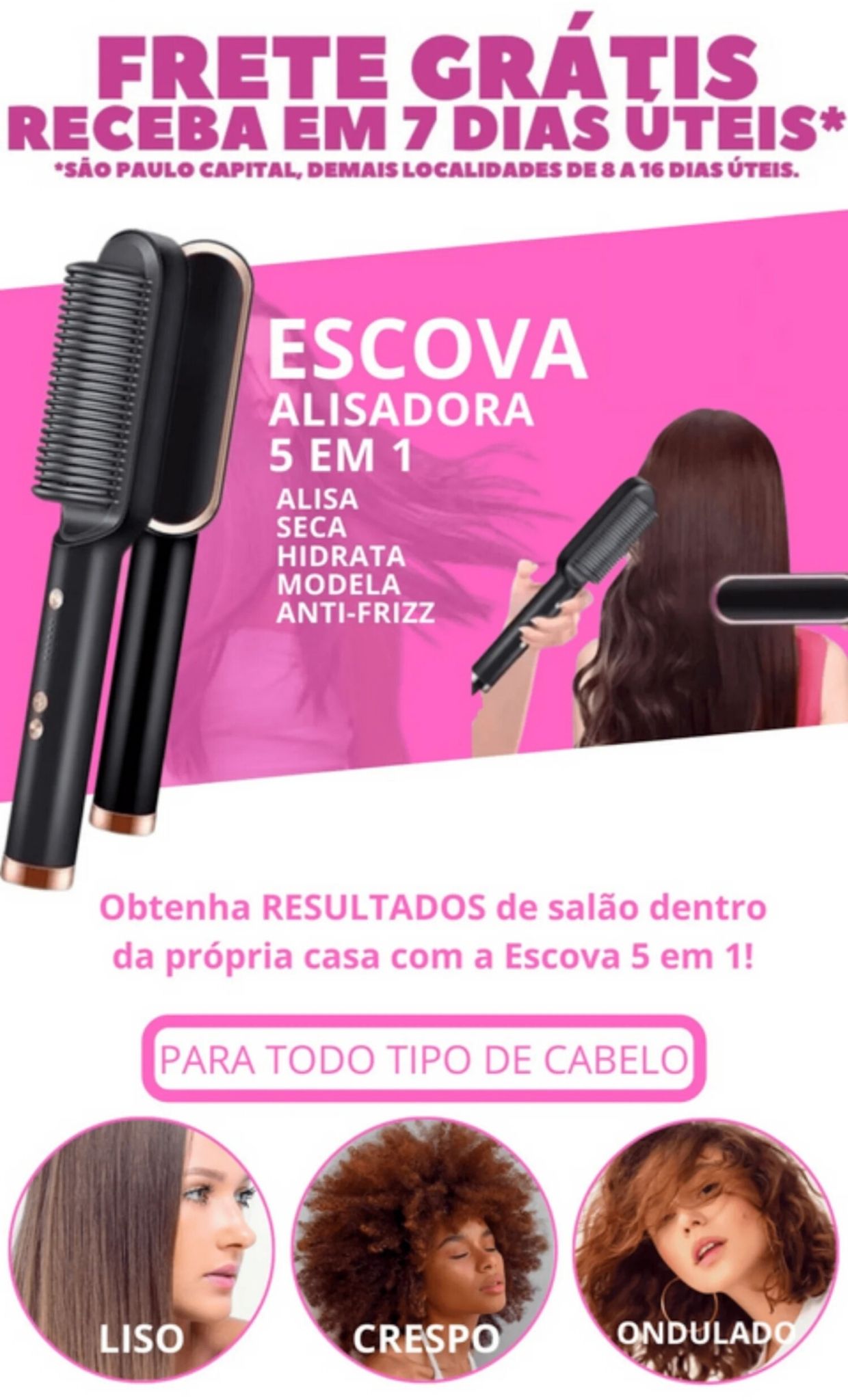 ALISE SEU CABELO EM CASA EM ATÉ 7 MINUTOS! A escova alisadora 5 em 1 Power Hair é a melhor solução para você alisar e escovar seu cabelo em poucos minutos e no sem sair de casa e com resultado profissional